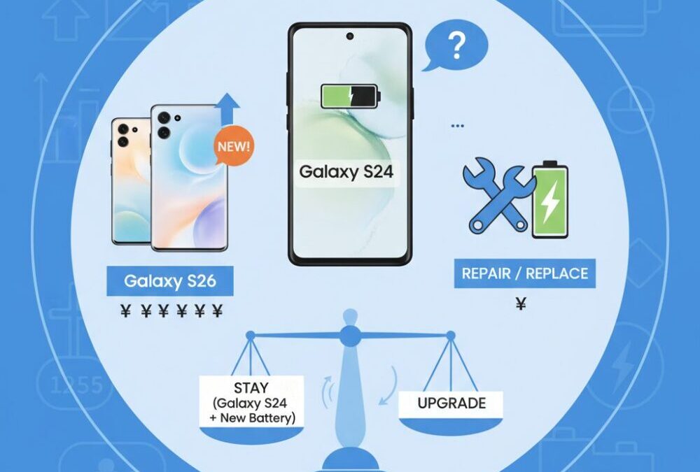 この記事では、Galaxy S24の現在の性能、バッテリーの寿命、バッテリー交換と買い替えのコスト差、さらにGalaxy S26・S25との違いまでを整理します。数字や具体例をもとに、あなたにとって後悔しない選択肢が見えてくる内容です。